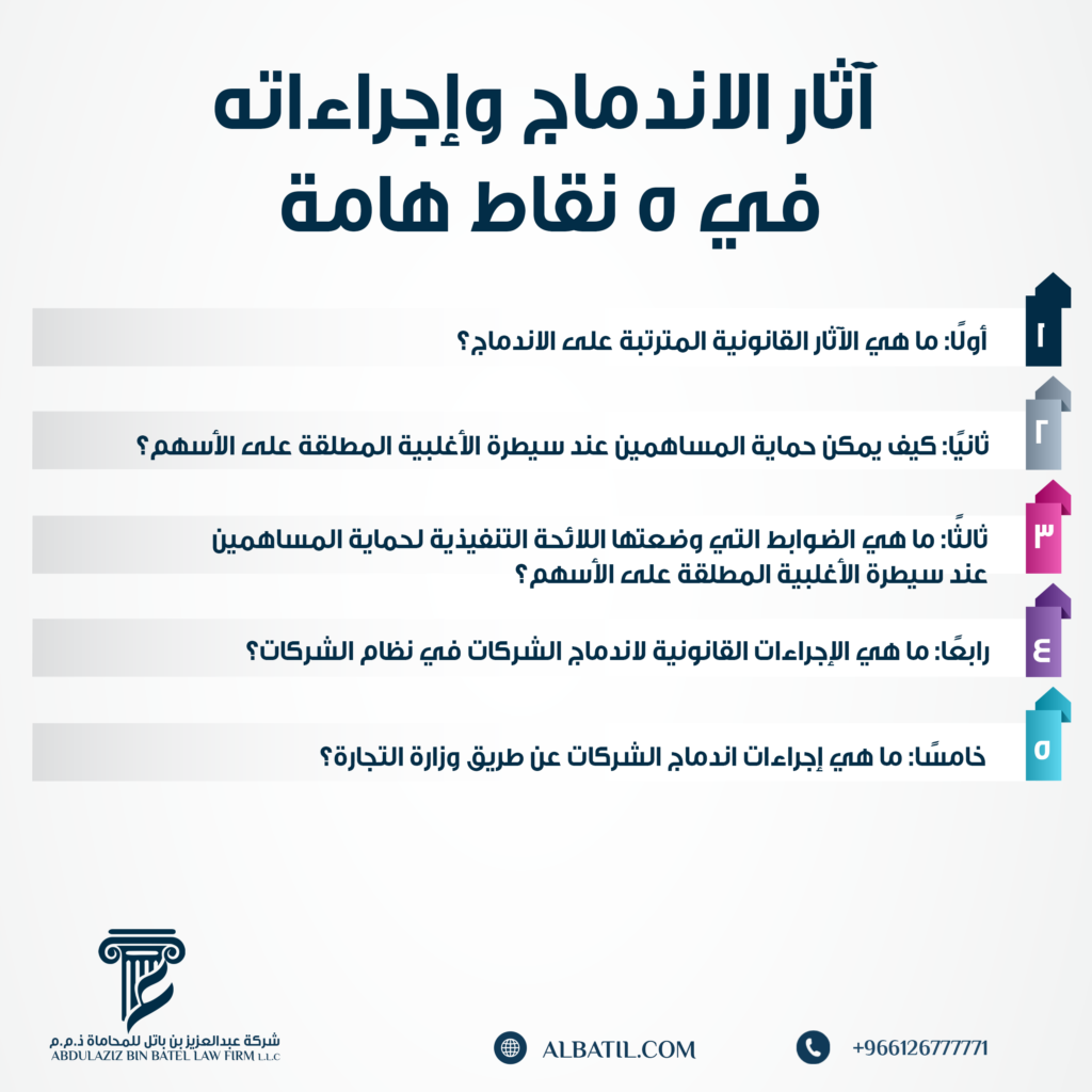 ويبرز نظام الشركات السعودي  كإطار قانوني متكامل يُنظم عملية الاندماج، موفرًا الإرشادات والتوجيهات اللازمة لضمان سلاسة الإجراءات وحماية حقوق جميع الأطراف ذات العلاقة. كما يسعى هذا النظام إلى تحقيق التوازن بين متطلبات السوق والمصالح القانونية، مع ضمان استمرارية الأعمال بشكل يضمن تعزيز الأداء الاقتصادي وتحقيق الأهداف المنشودة للكيانات المندمجة. لذلك جاء هذا المقال ليتناول آثار اندماج الشركات، والإجراءات القانونية المتبعة لتنفيذه، مع تسليط الضوء على أبرز التحديات التي قد تواجه الشركات في عملية الاندماج والفرص التي يتيحها النظام القانوني لتعظيم الفائدة من هذه العمليات، وذلك على النحو الآتي: