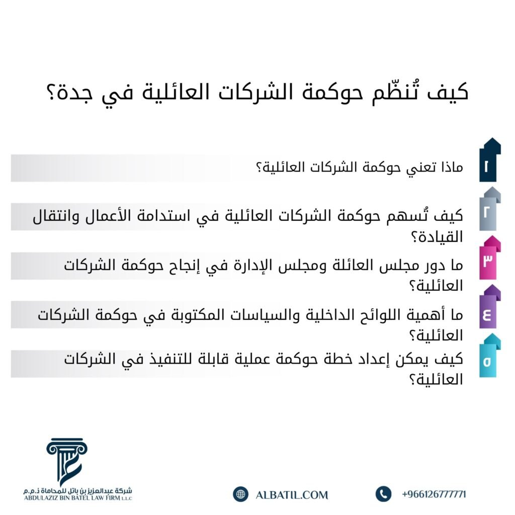 ومن ثم، فإن اللوائح والسياسات المكتوبة ليست أدوات إدارية صرفة، بل هي منظومة قانونية داخلية تُشكّل العمود الفقري لكل نموذج ناجح في حوكمة الشركات العائلية في جدة، وتُعد المؤشر الأوضح على وجود إرادة عائلية جادة لتحويل الشركة من كيان قائم على الروابط الشخصية إلى منظومة احترافية مُؤطرة قانونيًا وقابلة للامتثال والمساءلة والانضباط الكامل.
